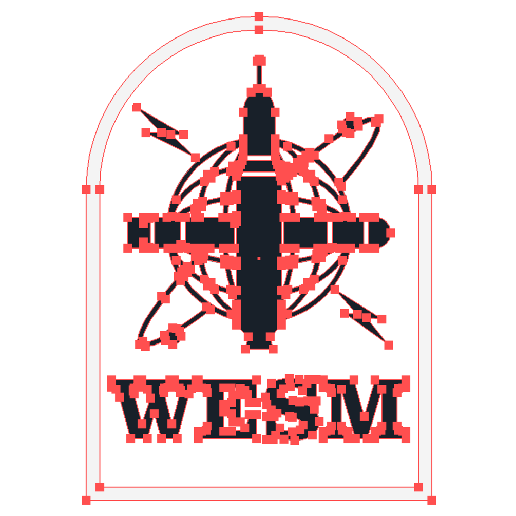 RN badge features an blue vertical trident missile, horizontal spearfish torpedo, superimposed on a globe, two satellites and two flashes with the letters 'WESM' below the device.